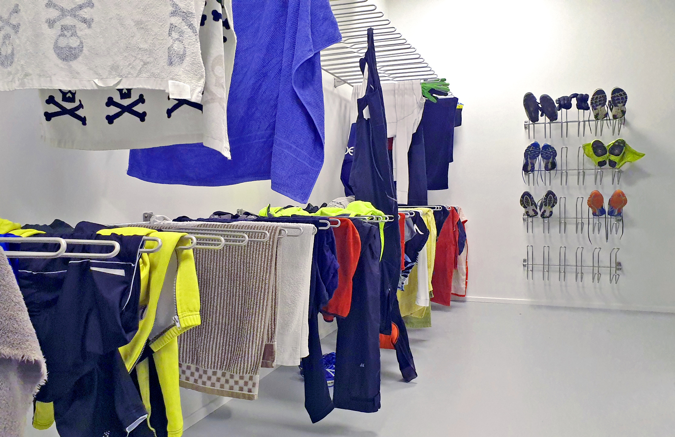 The Munters’ drying room concept is based on desiccant dehumidification, which is a dehumidification principle invented by Swedish founder Carl Munters, more than 60 years ago. Dehumidification offers the key advantage that clothes will be completely dried without any use of heat and, thus is a sustainable solution that supports companies’ desire for a green profile. The drying room concept is a complete Turn-Key concept, where Munters, in addition to dehumidifiers, fans and control also supply a tailor-made rack system made of stainless -steel. Working with only one supplier, Munters, the contractor/end user avoids coordinating several different suppliers. Munters has the necessary knowledge to make the whole delivery and installation process easy for the customer. Happy employees heading home in dry clothes In the NEXUS office building, near Dybboelsbro Station in Copenhagen, 2,200 government employees work. An almost 20,000 m2 underground parking lot can hold 350 cars and 1,640 bicycles. The basement is also furnished with a gym and changing facilities, and a Munters drying room. Employees that bike to work are offered efficient drying of their wet fitness and bicycle clothes, towels, and footwear. The drying room is equipped with two Munters dehumidifiers and eight circulation fans. On the walls of the 32 m2 room, the easy-to-use and clean stainless steel rack system is mounted, holding both clothing, shoes, and towels. The drying room is equipped with a PIR (motion sensor) control, which automatically activates the fans. When the humidity in the room rises, due to wet clothes, the dehumidifiers are automatically activated via the moisture sensor and clothes are efficiently and gently dried. By the end of working day, the employees are then able to jump back into their now completely dry clothes for their run or bike ride back home. On-demand operation minimizes energy consumption Depending on the size of the drying room, one or more desiccant dehumidifiers are used, which are controlled by a humidistat (moisture sensor with control) which activates and controls the system and is fully automatic. This kind of demand-controlled operation ensures that the system is only in operation when needed, limiting energy consumption to just what´s needed to dry the clothes. That’s what we call energy efficient A quick calculation: From that one-kilowatt hour that a Munters drying room concept typically consumes to remove one liter of water from the air, 50% of the energy is brought into the room as warm and dry air, and thus helps heat the room. The remaining 50% leaves the room with the warm, wet air. Adding this airstream to the building’s heat recovery system during cold months, actual consumption is limited to 0.25 kWh. It´s the cheapest drying method available! Fully approved concept with more than 350 Danish installations The concept itself originates from the Armed Forces, where Swedish-based Munters Group has been for decades the main provider of drying equipment for combat uniforms, diving suits and equipment. Using desiccant dehumidification to dry clothes has proved to be the most energy-efficient method, compared to other drying methods, including refrigerant dehumidification. This has been confirmed in COWI’s report prepared for the Danish Defense Building Services’ “The optimal drying room” 52813.10/Oct.2002. The Munters method is also extremely gentle, since clothes are not exposed to high temperatures typical in electrically-heated drying cabinets. Clothes therefore last longer, and since clothes are thoroughly dried and not just warmed (as in a drying cabinet), associated odors are avoided. The Munters concept has successfully found its way to a large and rapidly growing number of day-care centers, pre-schools, police and fire stations, housing associations and dorms, where quick laundry turnover is important. Read more about Munters drying concept on our website