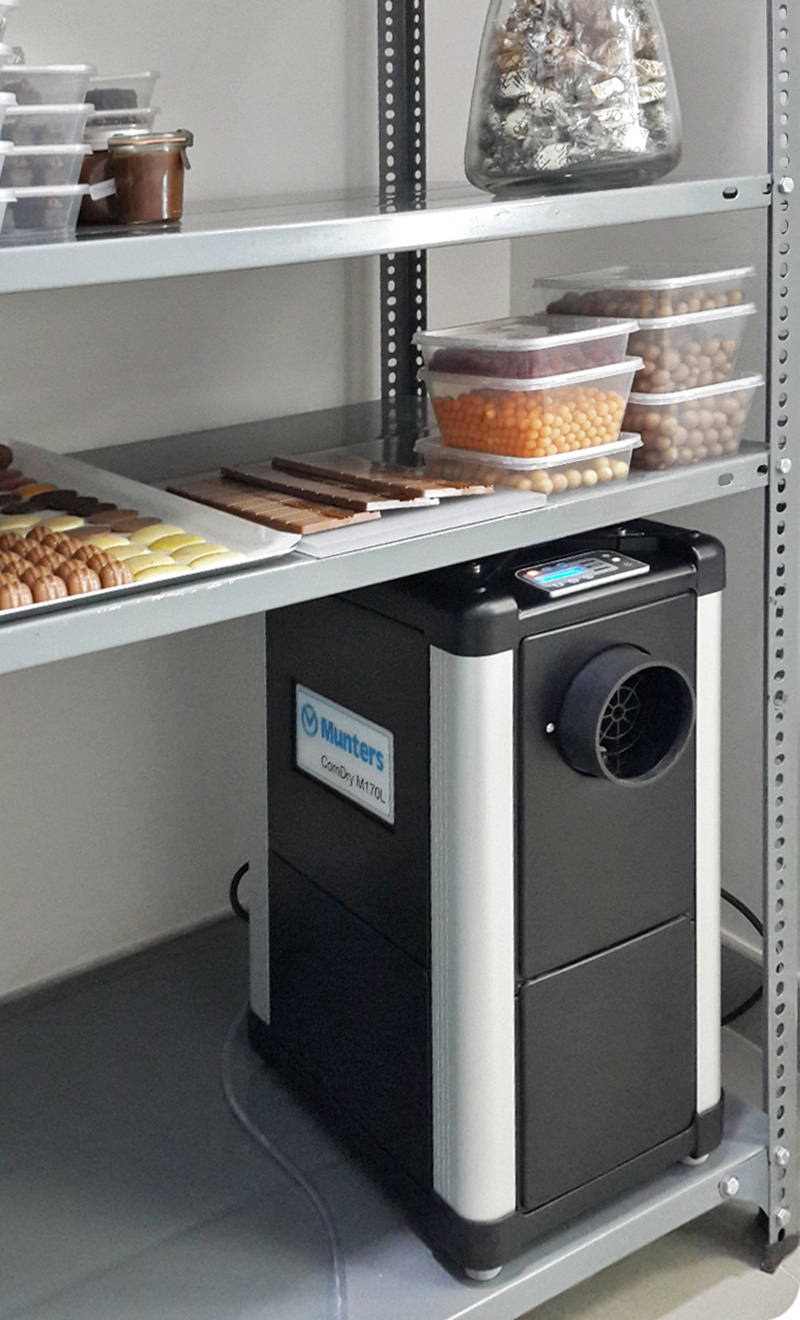 Munters arranged a visit to The Chocolate Academy and soon realized that something had to be done to control the humidity in the storage area. By installing a ComDry M170L, the problem was eliminated and the production could get going again. “The problem is now solved! The dehumidifier is very reliable, stable and exceeds our expectations,” explains Philippe Marand, Head of The Chocolate Academy. The ComDry series is a range of desiccant dehumidifiers with high reliability and low energy consumption. The air-cooled condenser cools the wet reactivation air below its dew point and the resulting water droplets are collected in a drip tray. This water is then pumped away with a built-in drainage pump. The Chocolate Academy can now continue to run its courses and train people without any interruptions or damaged chocolate creations.