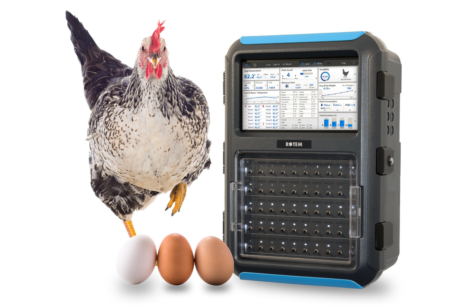 Get real-time control of layer hen house climate from any device. Our cloud-based software includes secure, optimized management of settings, profiles, and devices. Control ventilation by temperature, humidity, CO2 and ammonia to maintain proper air quality.