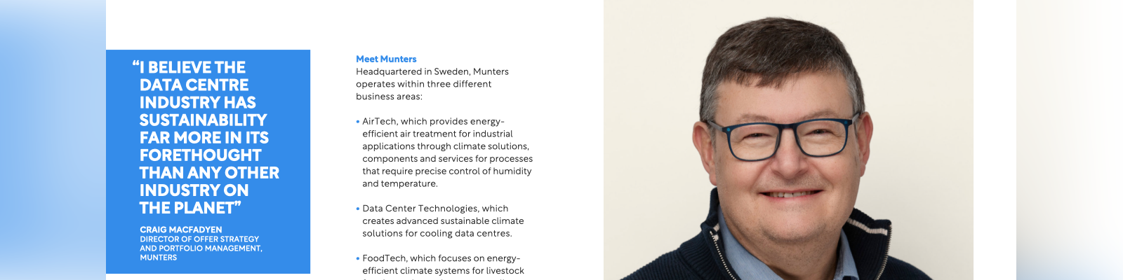En una entrevista con Data Center Magazine (p. 122), Craig MacFadyen, Director de Estrategia de Oferta y Gestión de Portafolio en Munters, habló sobre la innovación impulsada por las personas, la sostenibilidad y el crecimiento futuro. Destacó el compromiso de Munters con la aceleración del desarrollo de productos a través de la integración de la retroalimentación de los clientes, su experiencia de dos décadas en refrigeración eficiente y su preparación para cumplir con normativas en evolución.