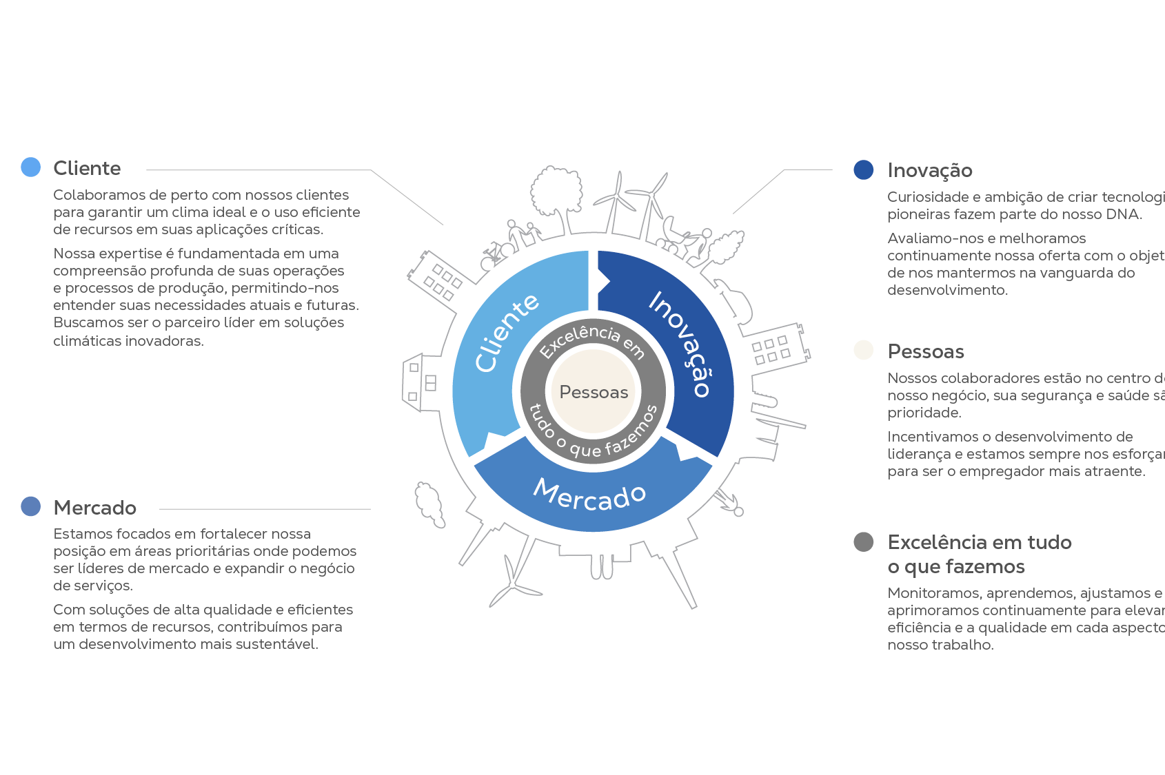 - Contribuímos para o sucesso de nossos clientes por meio de soluções de controle climático com alta qualidade e eficiência energética que tornam suas operações sustentáveis.