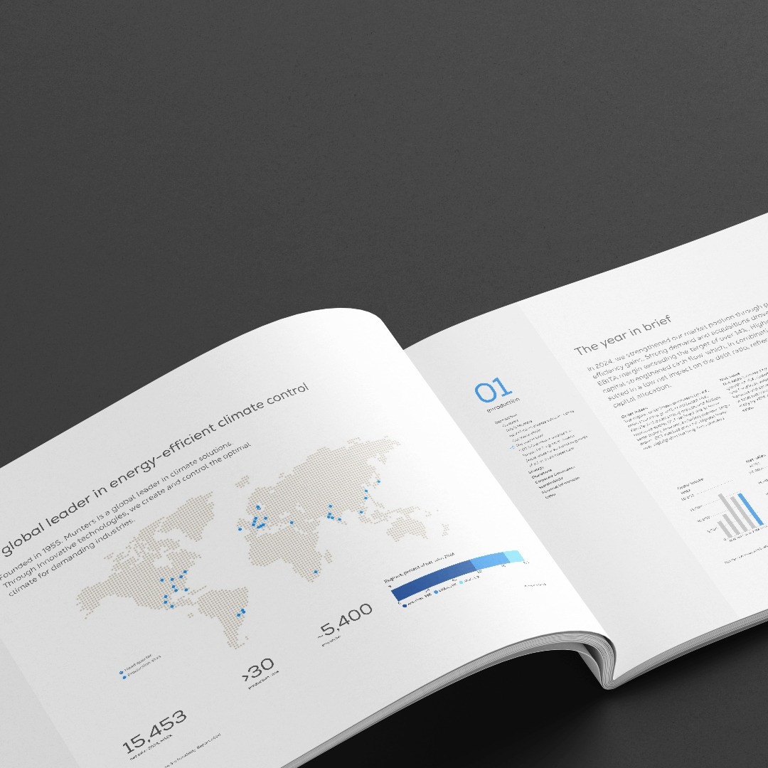 Års- och hållbarhetsredovisningen trycks även i en mindre upplaga och kan beställas från investorrelations@munters.com.